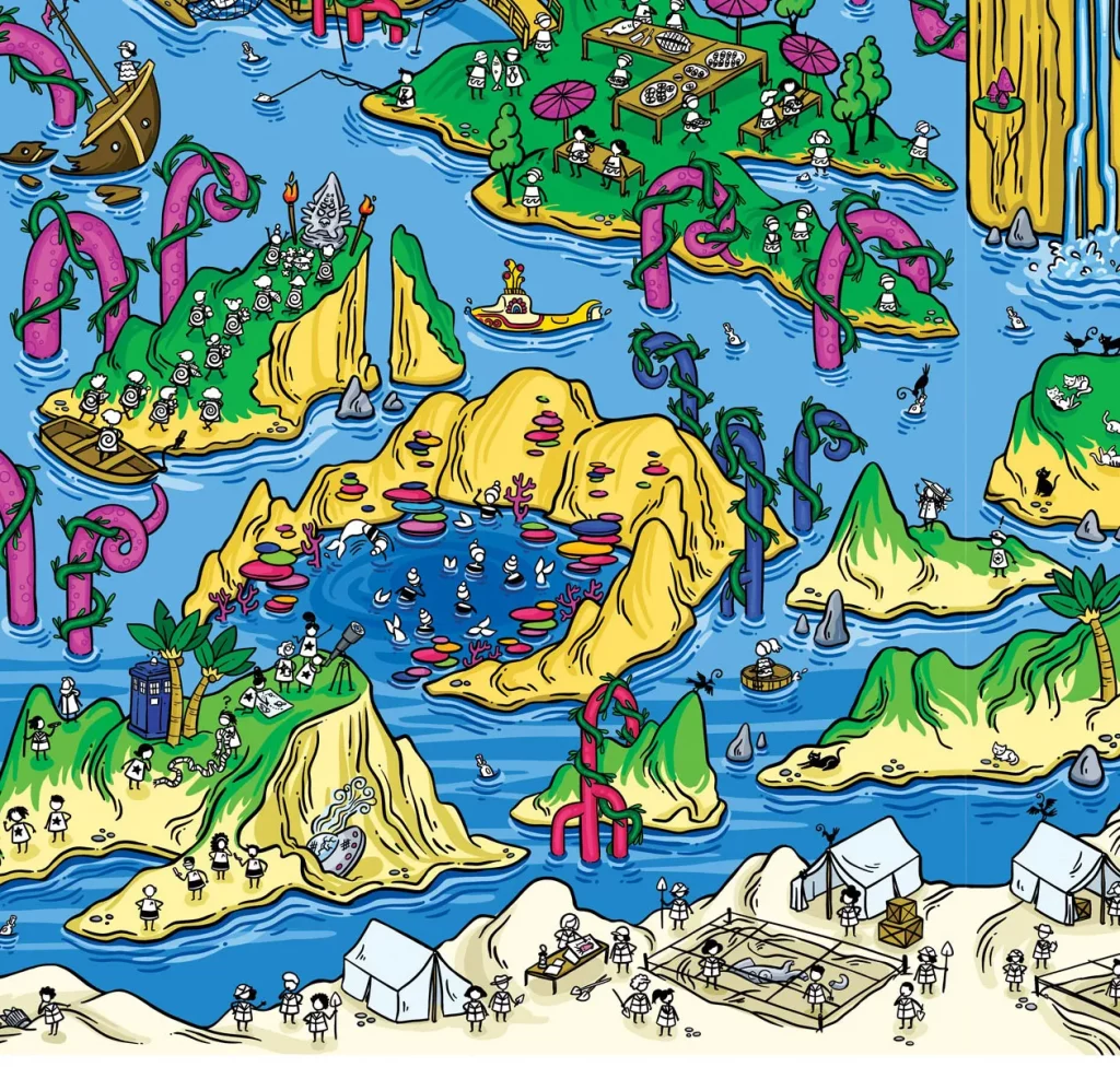 The Odd Pieces puzzle company isn’t quite so secretive about how their puzzles work, and never claimed to be working with mathematicians or illusionists. Their puzzles all depict a very busy Where’s Waldo-esque scene filled with hundreds of little characters. The twist is that the picture on the box isn’t exactly the picture on the puzzle you’re putting together. The puzzle is set a few moments after the picture on the box, and as you assemble it, you piece together the storyline of what happened to cause everyone to suddenly move and slightly change: