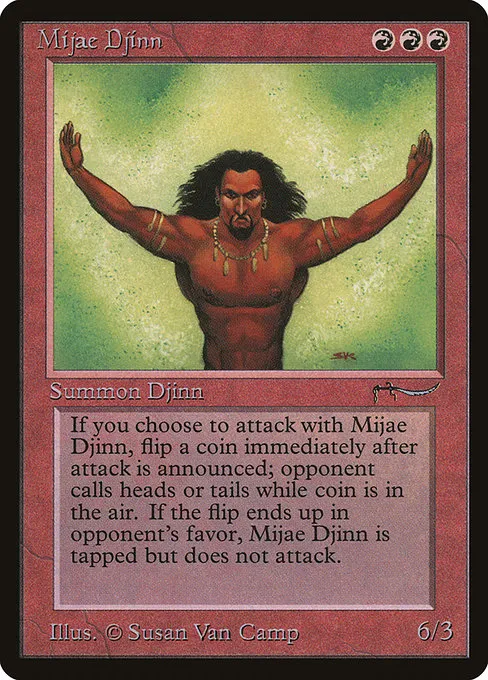 There are two cycles of four cards in the set. Four efreet (more commonly spelled Ifrit these days) – malevolent spirits or demons common in Islamic myth, and four Djinn, or genies. White doesn’t get either. As Garfield put it – “They didn’t seem to belong in white–while not always evil, they were never good.”